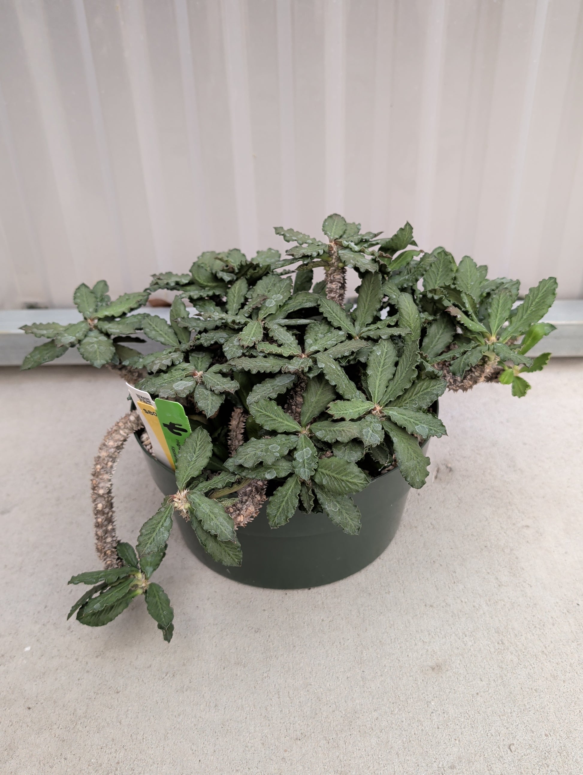 Like all Euphorbias, this plant exudes a milky latex sap when cut. It can be irritating to skin and toxic if ingested. Handle with care and keep away from pets and children.
