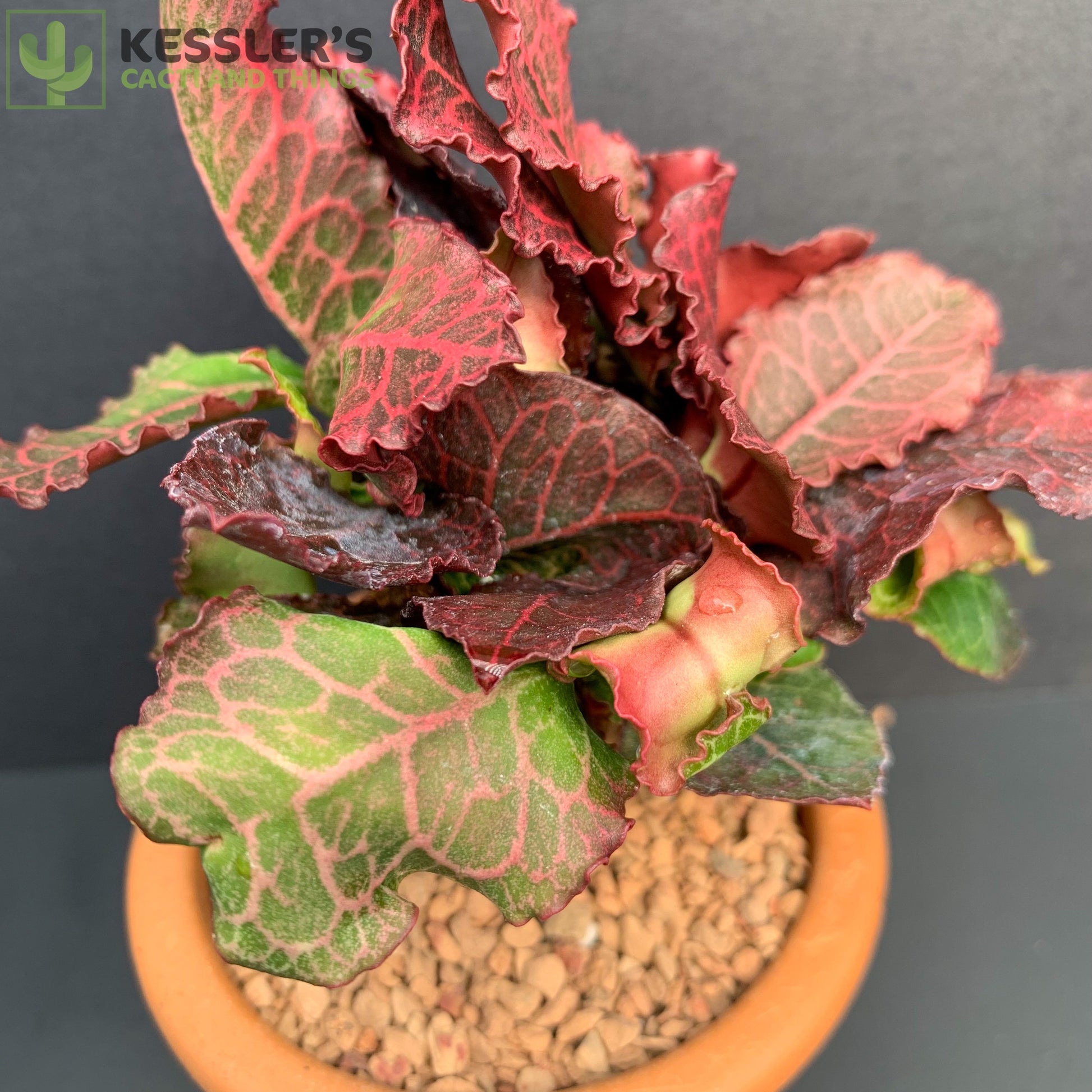 Euphorbia francoisii ‘Thai Hybrid’ is a highly sought-after cultivar of the Madagascan species, prized for its colorful, variegated foliage and wild, twisting leaf shapes. This hybrid has been selectively bred in Thailand for bold patterns, deep reds, purples, greens, and even pinkish tones, making each plant completely unique and a showpiece in any rare plant collection.