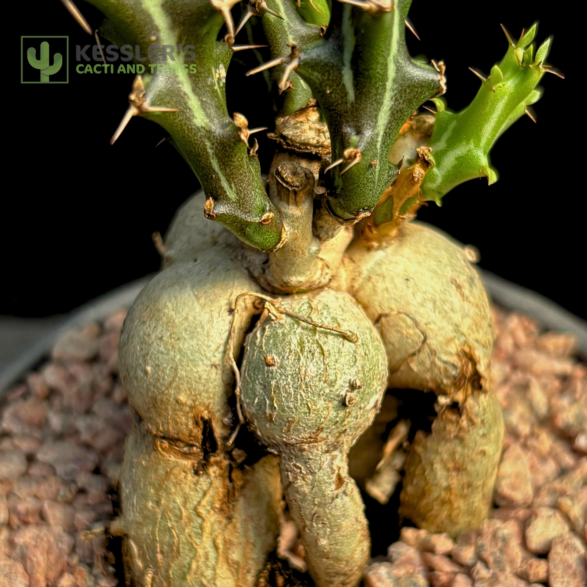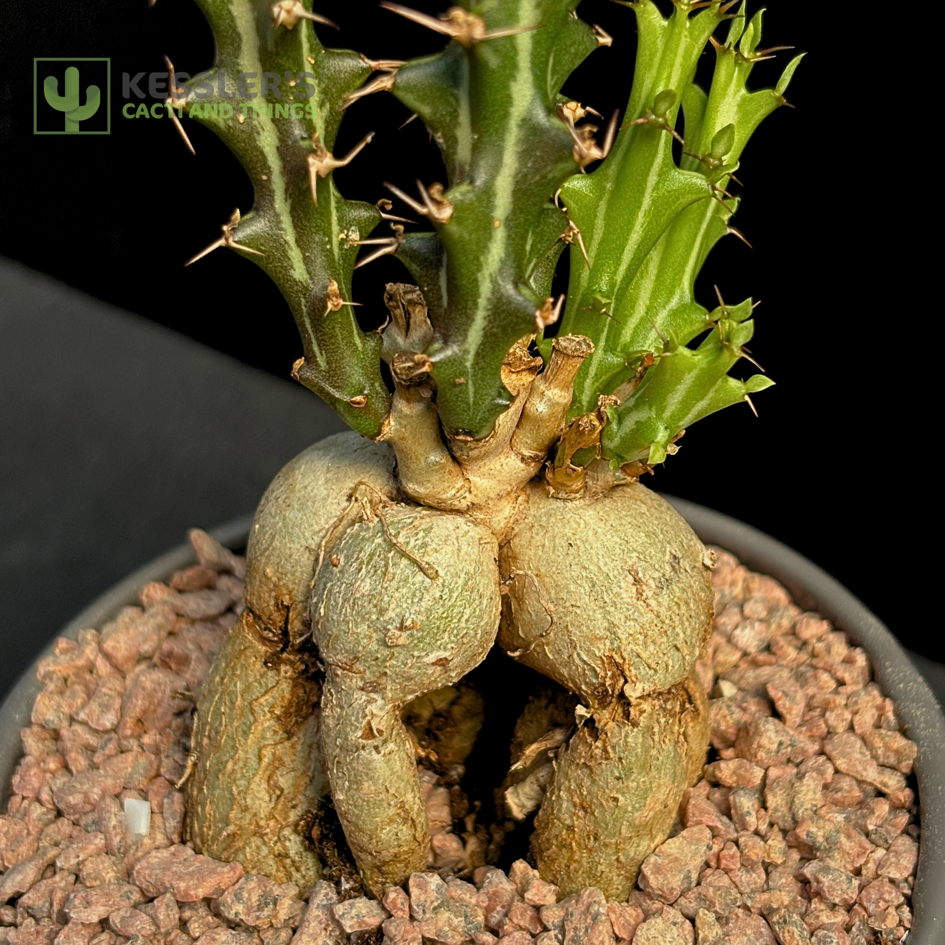 Native to South Africa, E. knuthii thrives in dry conditions and is known for its resilience and quirky growth. With time, the caudex becomes even more pronounced, adding to its bonsai-like charm.