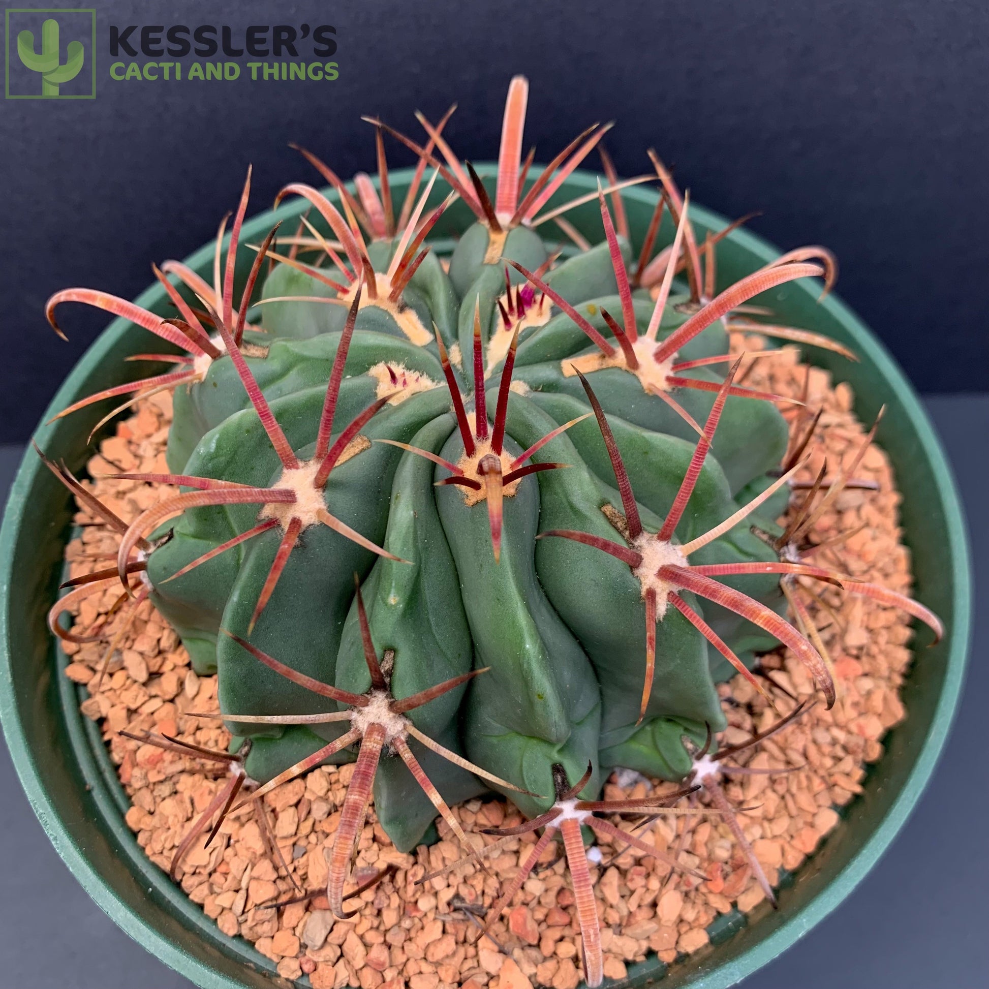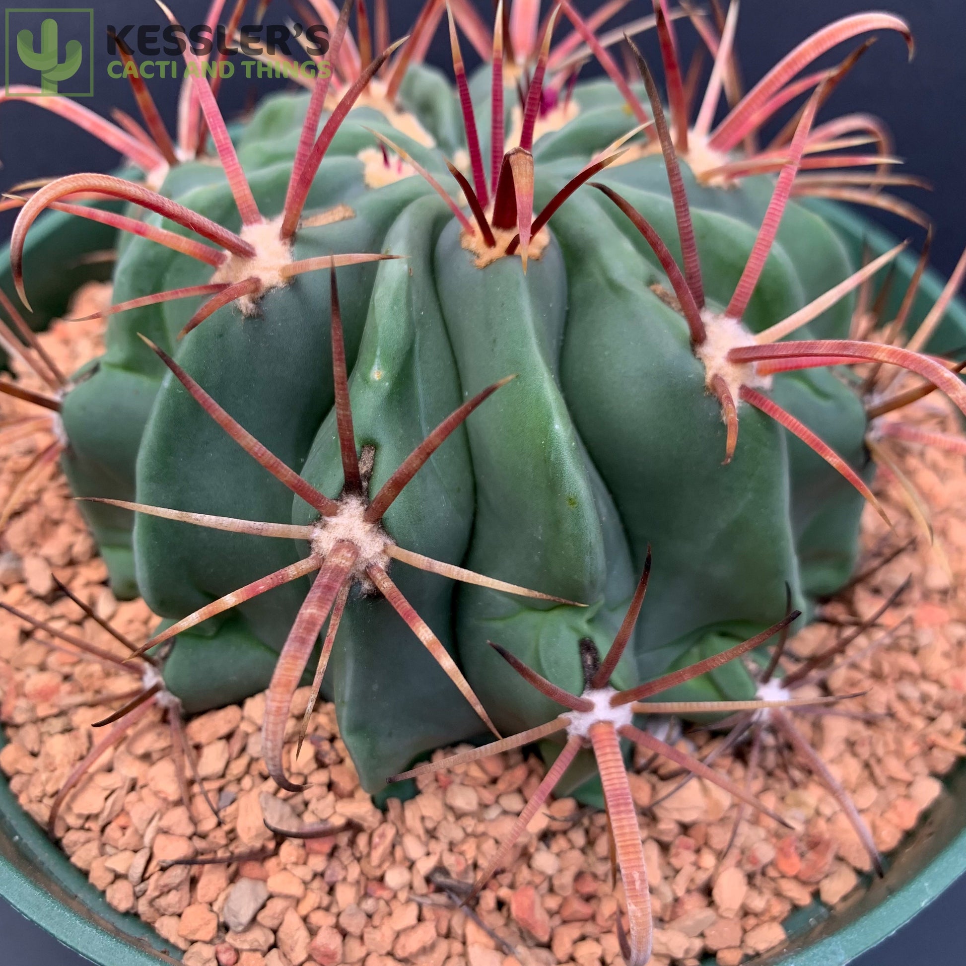 Ferocactus latispinus, also known as the Devil’s Tongue Barrel, is a compact and fiercely beautiful cactus known for its dramatic, flattened central spines that curve outward like a serpent’s tongue. These wide, ribbon-like spines range in color from deep red to purplish-pink and sit atop a squat, heavily ribbed body that stays low and round for many years.