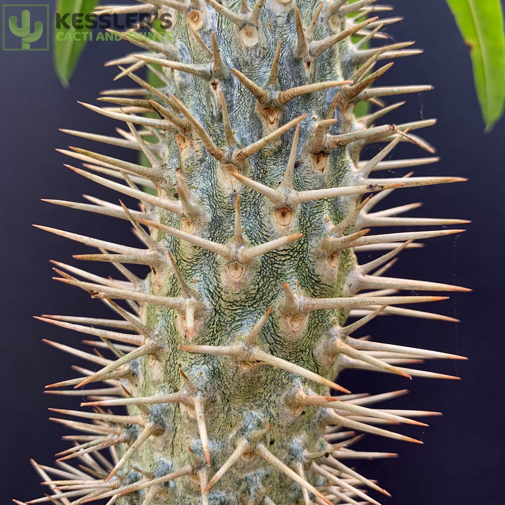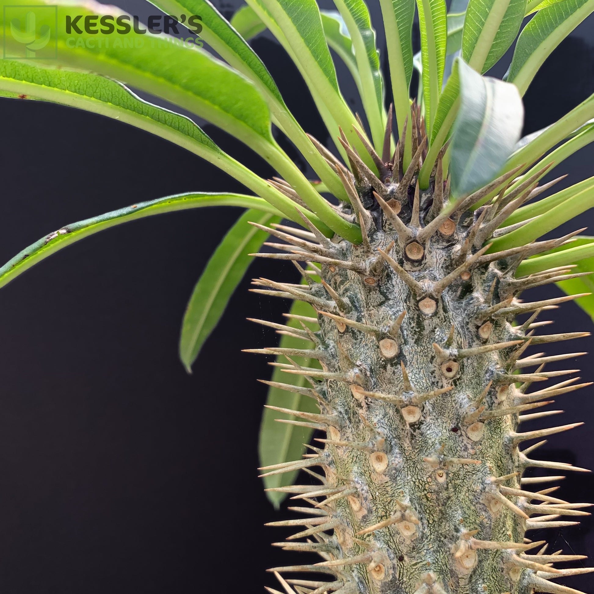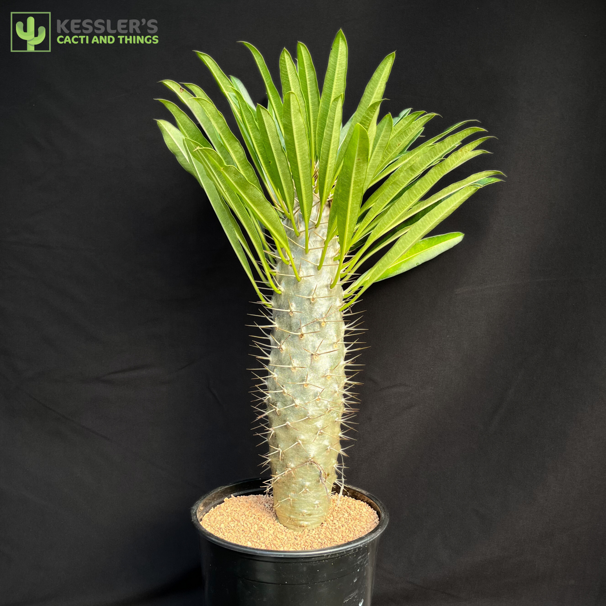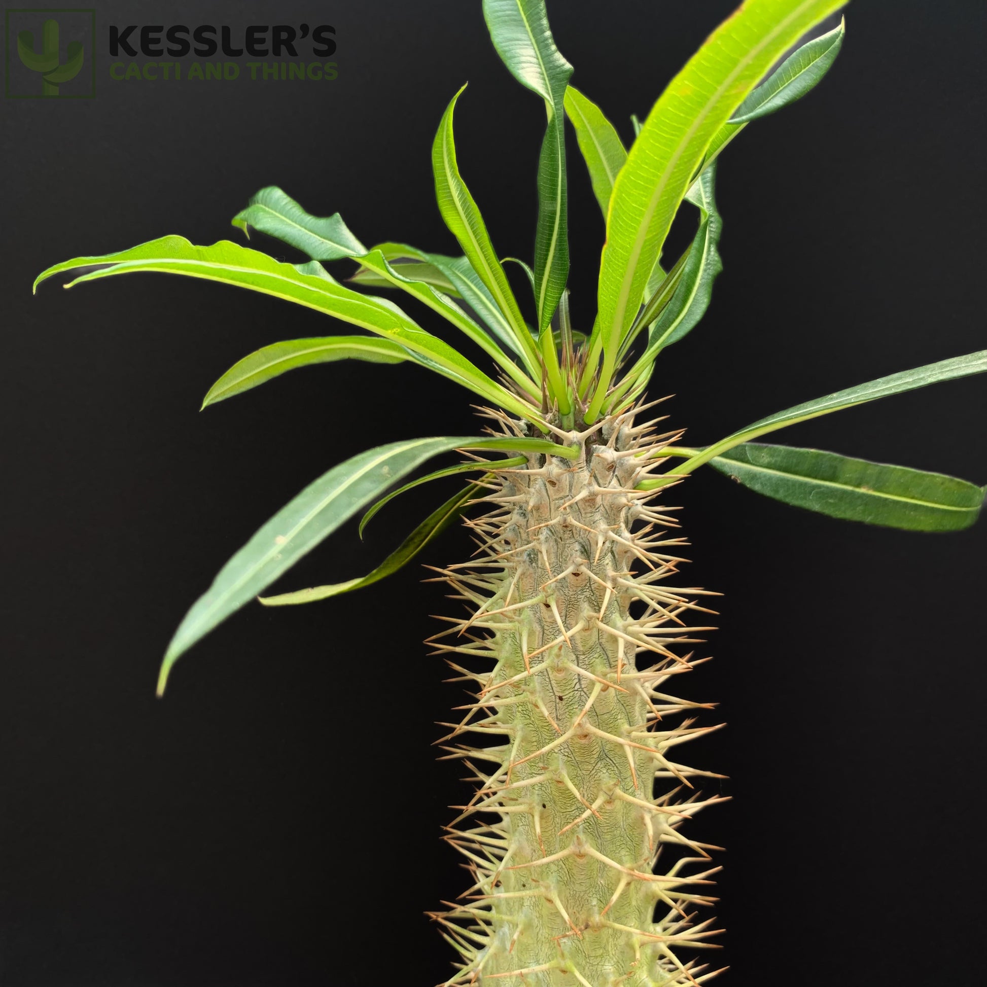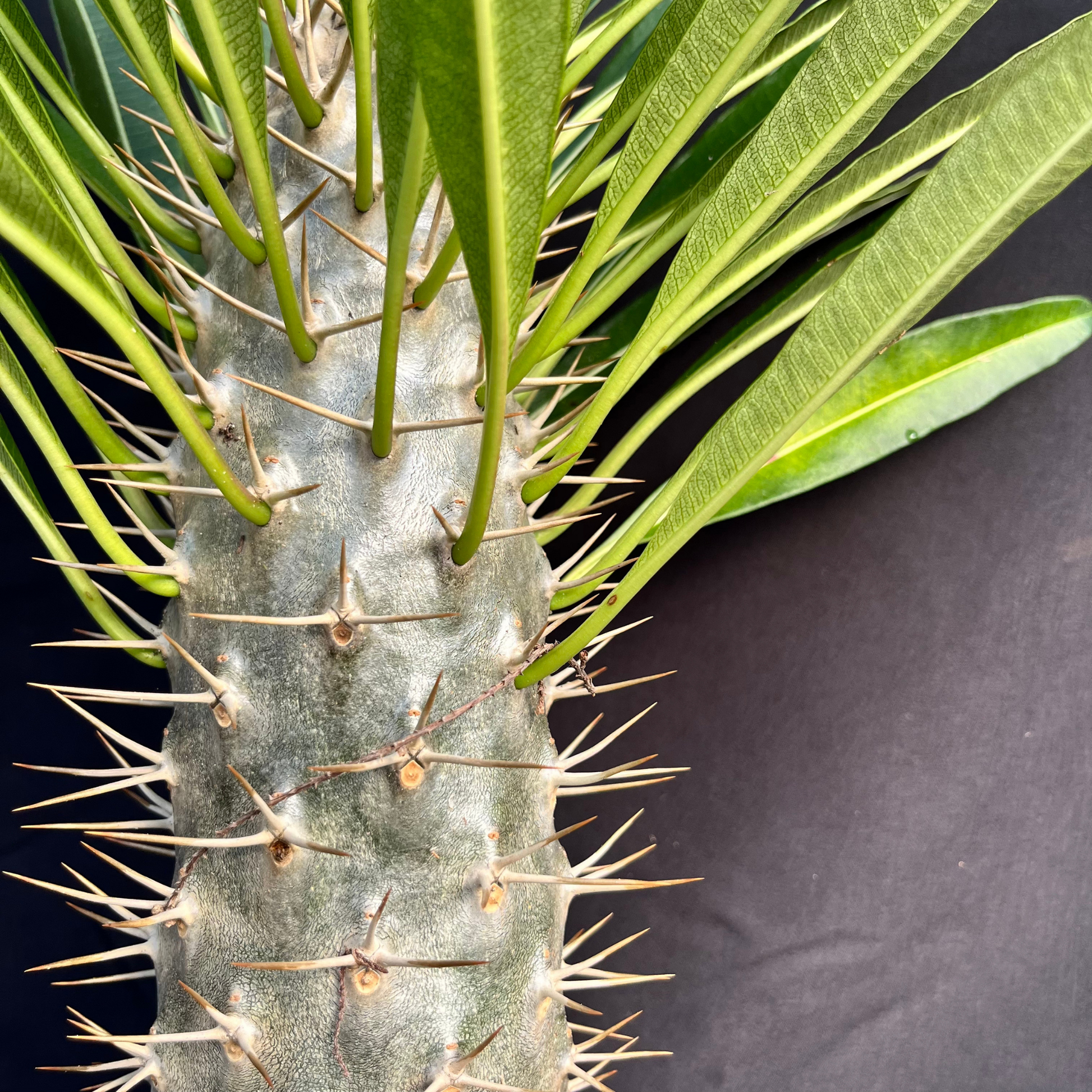 Its swollen, silver-green trunk is covered in sharp spines, which help protect it in the wild and store water during long dry seasons. At the top, a crown of long, deep green leaves emerges—especially when grown in bright light. Mature plants may even produce fragrant white flowers with yellow centers when kept outdoors in warm climates.