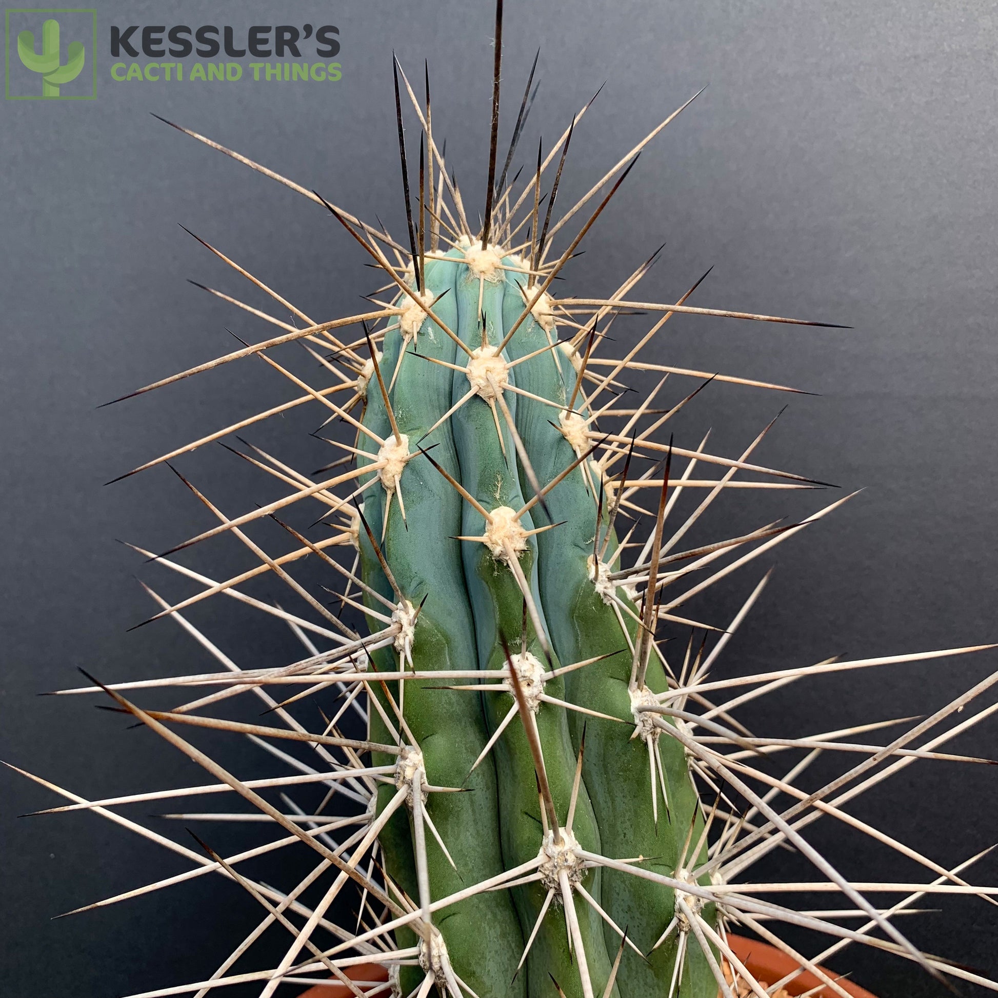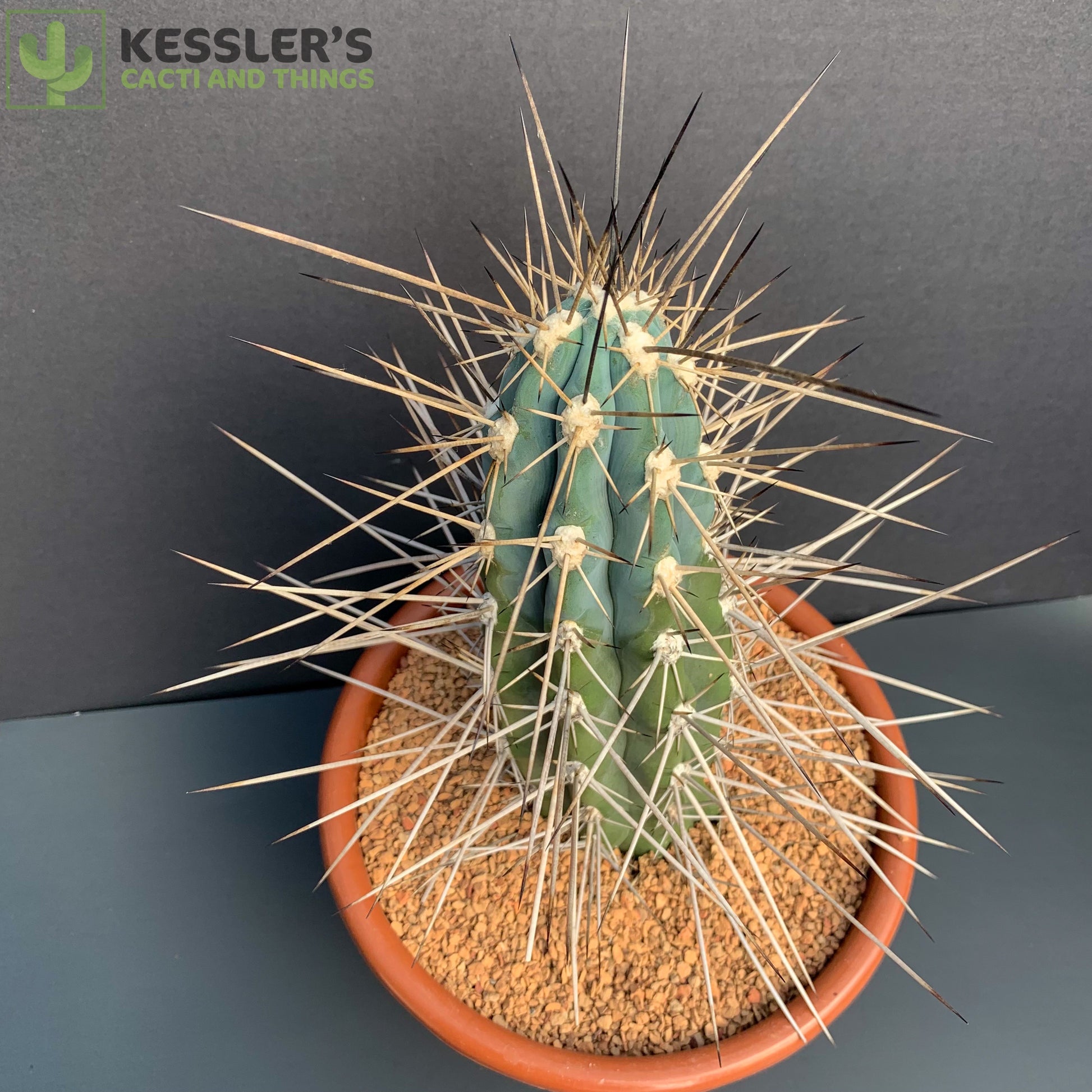 Stetsonia coryne, also known as the South American Saguaro or Toothpick Cactus, is a striking, slow-growing columnar cactus native to Argentina, Bolivia, and Paraguay. It features tall, tree-like stems with deep vertical ribs and fierce, dark spines that resemble sharpened toothpicks—making it both impressive and intimidating in appearance.