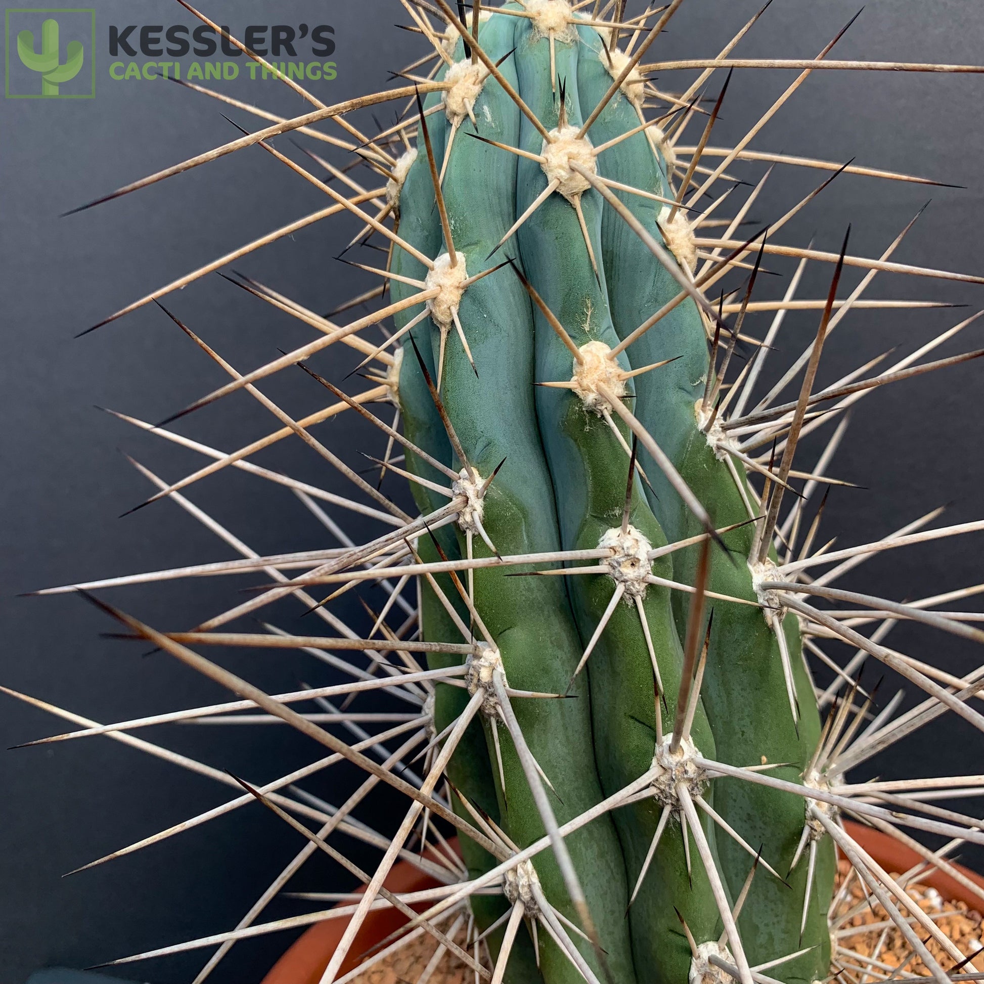 Its blue-green to olive stems can eventually form a branched, candelabra-like silhouette, reminiscent of the North American Carnegiea gigantea (true Saguaro), but with a more rugged and wild look. Mature plants can produce white, funnel-shaped night-blooming flowers, followed by edible fruits enjoyed by wildlife.